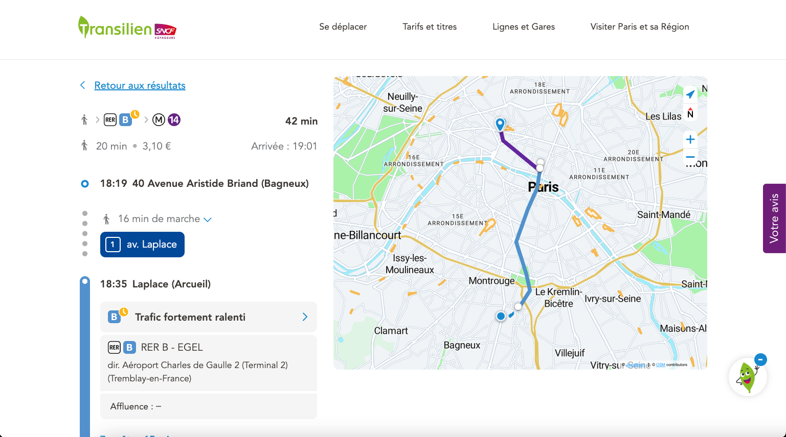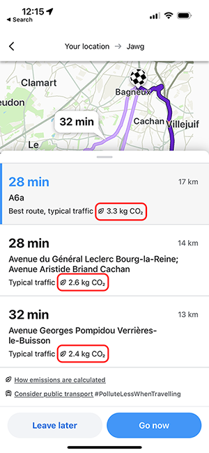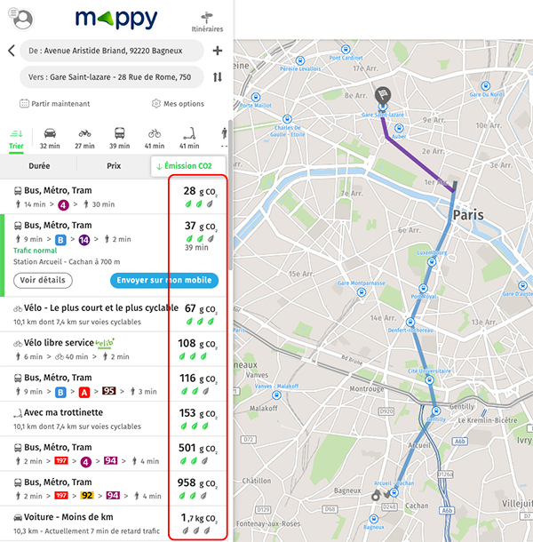 Dans l'exemple ci-dessous, Mappy propose différentes options d'itinéraires, classées par leur niveau d'émission CO2.