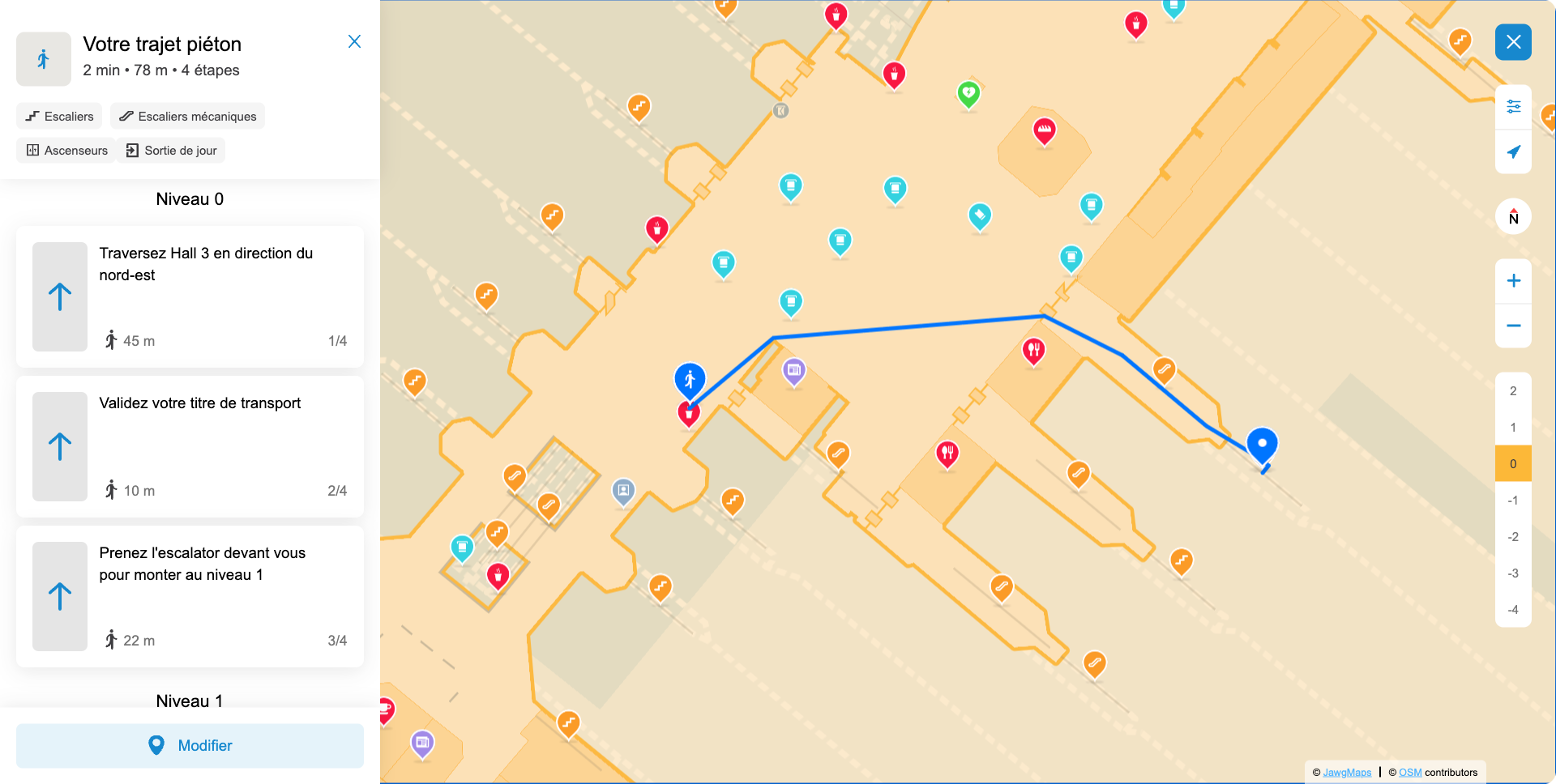 Outre la planification des trajets en extérieur, une innovation majeure dans le domaine des transports publics est l'intégration de la cartographie et du routing en intérieur. Les vastes complexes de gares et de stations de métro peuvent être de véritables labyrinthes, rendant difficile l’orientation des passagers.