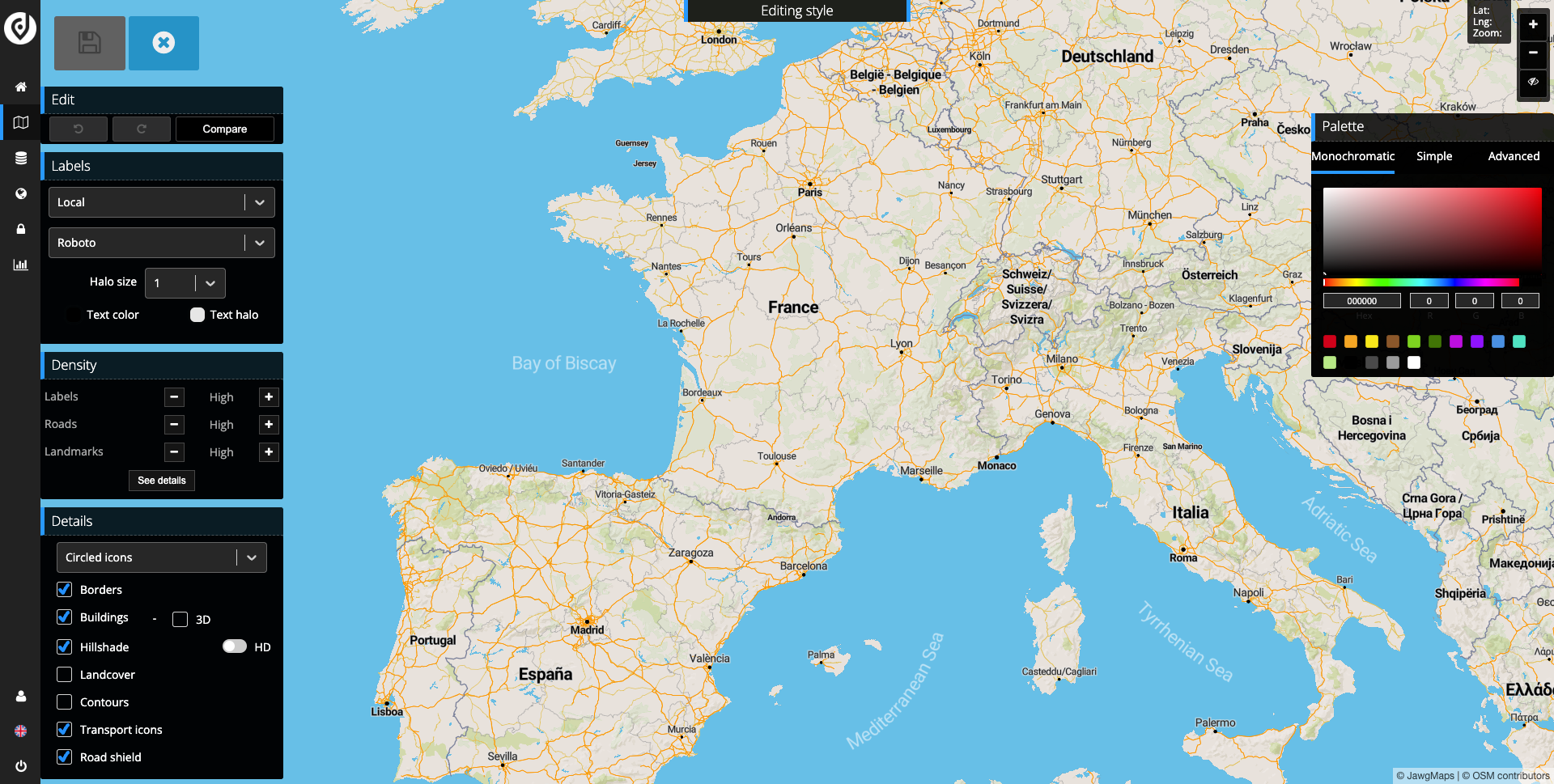 Vos tuiles peuvent être facilement personnalisées en modifiant leur style et leur(s) couche(s) de données. Cela permet de créer des cartes uniques et adaptées à vos besoins, et de choisir les couleurs, polices, symboles, niveaux de transparence et plus encore, qui conviennent le mieux à votre projet.