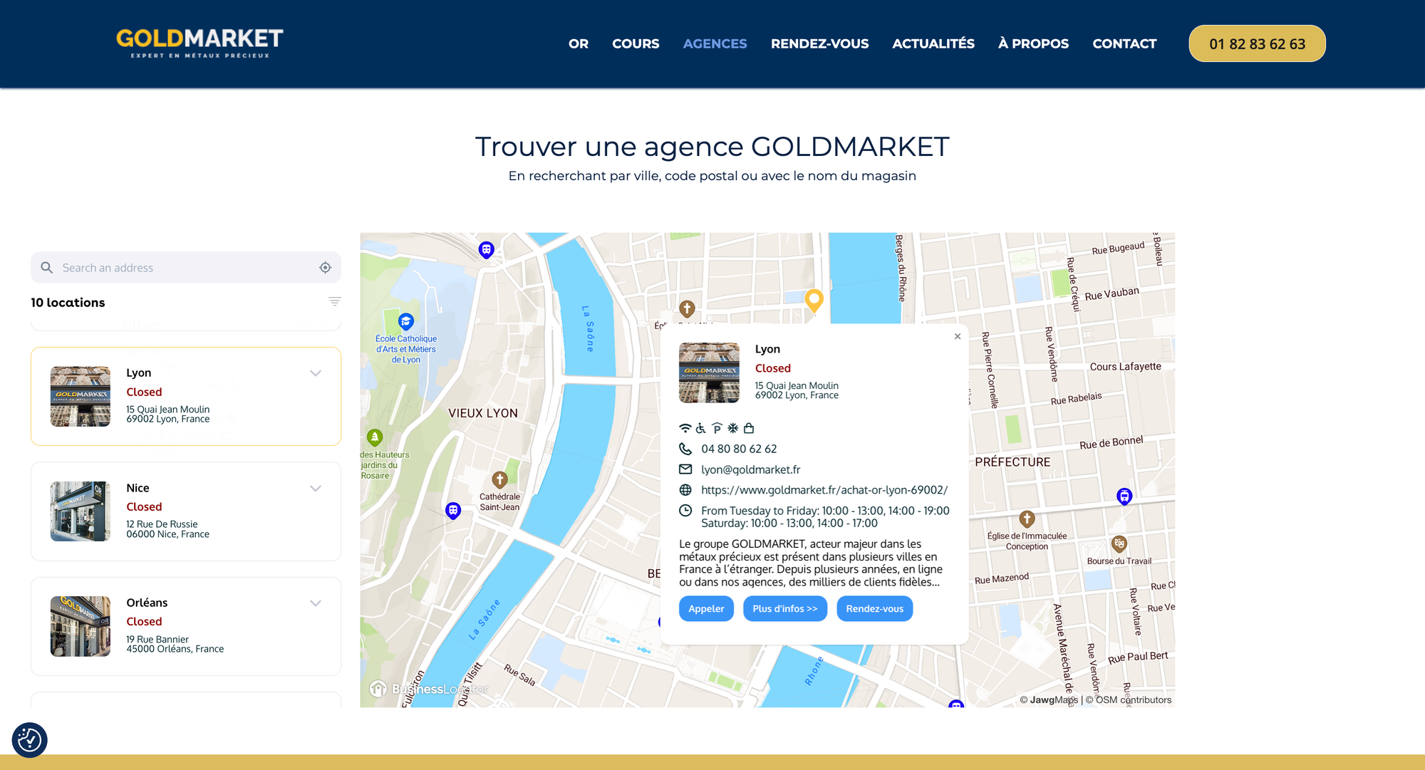 Avec ça, toute personne qui cherche à vendre ses objets en Or ou à investir dans l’Or, saura exactement où trouver l'agence Goldmarket la plus proche de chez elle et comment la contacter 💰