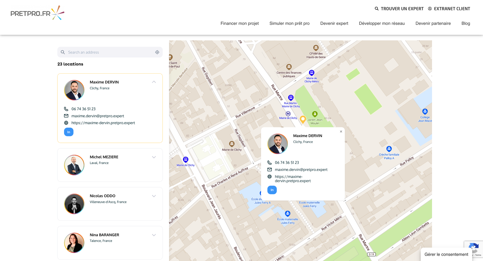 Les personnes qui souhaitent optimiser leur financement avec un courtier en prêt professionnel, peuvent retrouver les 23 experts référencés par le réseau Pretpro.fr, grâce à la carte BusinessLocator sur leur site internet 🧑💻