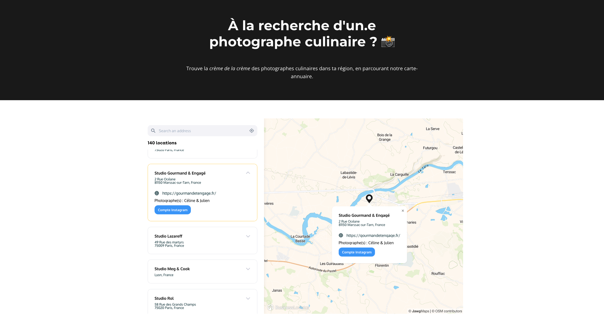 Si vous travaillez dans le secteur culinaire et que vous avez besoin de photos professionnelles pour votre business, vous pouvez parcourir l'annuaire Pixel Gourmand pour trouver les photographes culinaires présents dans votre région.